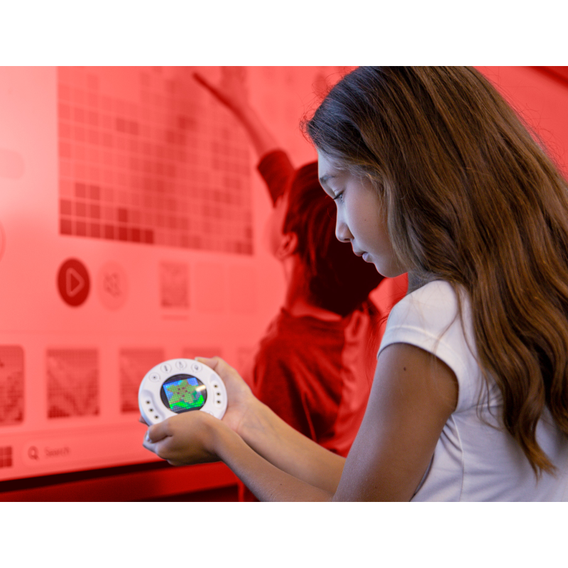 Using a 16x16 LED grid and colorful canvas, students can design digital pixel art and simple animations. For example, they can code a flower’s leaves to open when the light sensor detects sunlight.