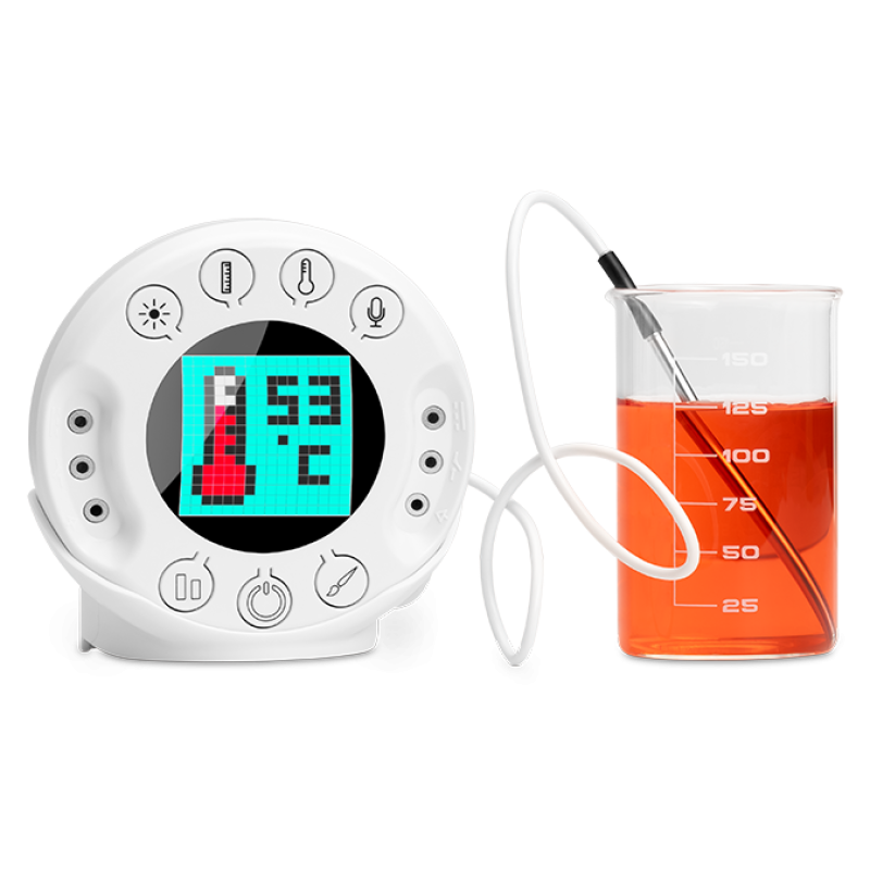 XploriLab comes with 5 built-in sensors: temperature, light, sound, motion, and voltage. It uses GlobiLab software to record and analyze data. Students can also control outputs like motors and lights based on sensor readings—for example, adjusting a greenhouse’s temperature automatically.